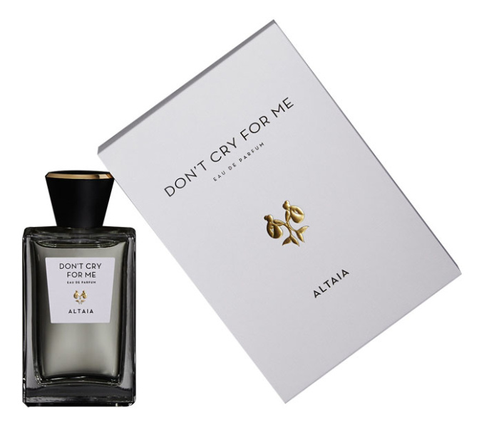 Don't Cry For Me от ALTAIA аромат относится к группе цветочные древесно - мускусные, создан в 2015 году. Состав парфюмерной композиций чай, жасмин, белая фрезиягелиотроп, вишняамбра, амбретта, лабданум, кашемировое дерево. Парфюмер создавший данную композицию