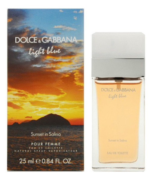 Light Blue Sunset in Salina Pour Femme от Dolce&Gabbana. Женский аромат - относится к группе цветочные водяные, создан в 2015 году. Состав парфюмерной композиций лист фиалки, виноградная лозажасмин, апельсиновый цвет, фрезиямускус, кедр, амбра. Парфюмер создавший данную композицию