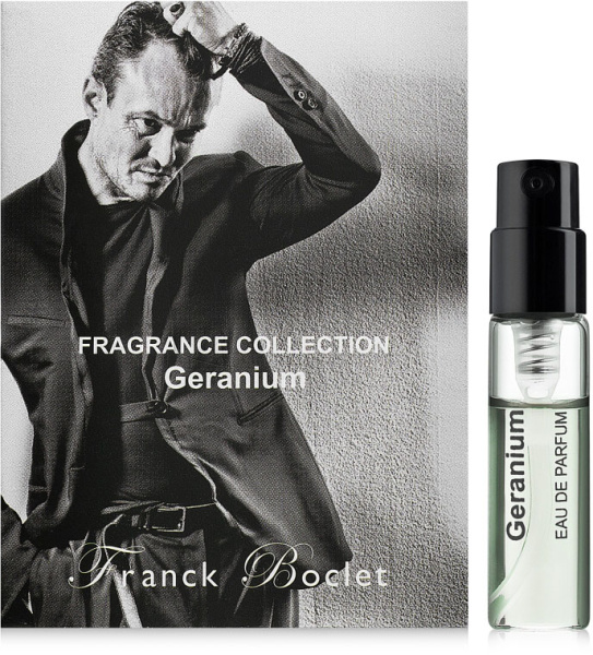 Geranium от Franck Boclet аромат относится к группе цветочные древесно - мускусные, создан в 2017 году. Состав парфюмерной композиций грейпфрут, лавандаапельсиновый цвет, гелиотроп, гераньмускус, ваниль, сандал. Парфюмер создавший данную композицию