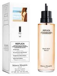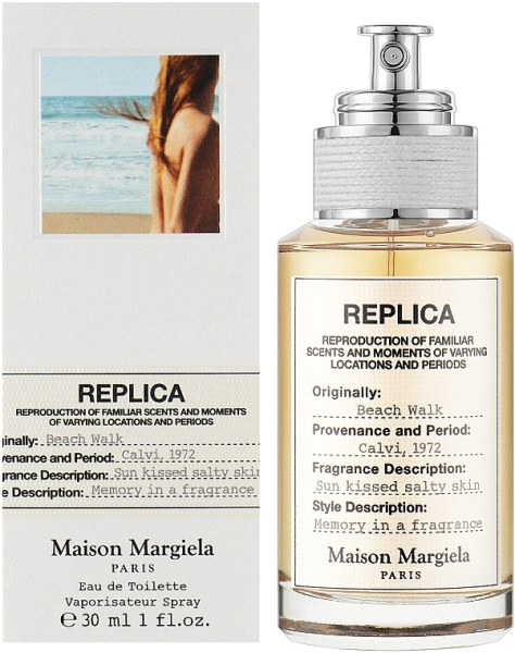 Дом Martin Margiela выпускает новую коллекцию ароматов под названием Replica, как дополнение к одноименной линии одежды. Парфюм - коллекция состоит из трех ароматов для женщин: Flower Market, Beach Walk и Funfair Evening. Каждый из них вызывает в воображении свой особый образ, на этикетку каждого помещено описание аромата, а на внешнюю коробку - фото- ассоциация.. Аромат, Beach Walk, сочетает в себе цитрусовые аккорды бергамота и лимона, розовый перец, иланг, кокосовое молоко, мускус и гелиотроп.