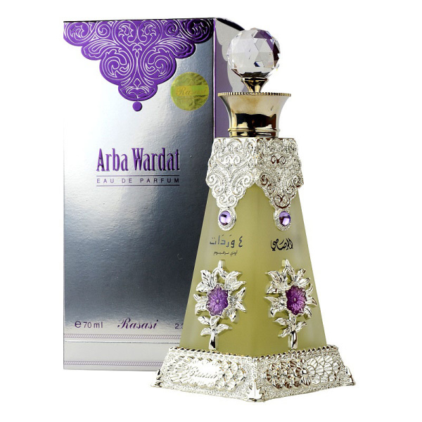 Rasasi - Arba Wardat - аромат, который готов подарить своей очаровательной обладательнице настоящую восточную сказку. Эта композиция, выпущенная в продажу в 2005 году, завоевала огромный успех, что неудивительно. Этот аромат, так же, как и композиция Rasasi Dalaa Al Banat Women, обладает очень устойчивой композицией, ведь в составе не использованы ни спиртосодержащие компоненты, ни вода. Эти ароматы будут радовать своим благоуханием очень долго. Аромат Rasasi Arba Wardat Women (Расаси Арба Вардат) раскрывает душевные качества своей обладательнице, насыщает каждый день приятным благоуханием цветов и ароматных компонентов. В состав этой парфюмированной композиции вошли ноты цитрусовых, мандарина, ананаса, жасмина, сладкой ванили, кумквата, мускуса, бергамота и смолы. Такое необычное сочетание привело к оригинальному и сказочному аромату.