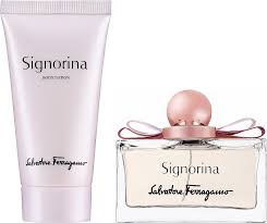 Salvatore Ferragamo Signorina («Сальваторе Феррагамо. Синьорина»). Этот необыкновенно свежий женский аромат с восточным характером выпущен парфюмерным домом Salvatore Ferragamo в 2011 году специально для юных девушек. Авторами нежной композиции стали Джульетта Карагуэзоглу (Juliette Karagueuzoglou) и София Лабе (Sophie Labbe). Аромат представлен в очаровательном прозрачном флаконе, верх которого венчает золотистый круглый колпачок и оригинальный розовый бант. Открываясь нежными начальными нотами красной смородины и розового перца, аромат Salvatore Ferragamo Signorina плавно сочетается с сердечными нотами жасмина, розы и пиона, оставляя неповторимый аромат юности из шлейфовых нот панакотты, листьев пачули и мягкого мускуса.
