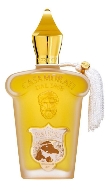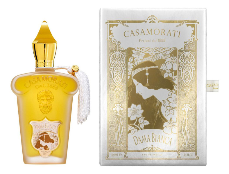 Xerjoff - Casamorati 1888: Dama Bianca - букет является частью семьи цветочных древесно-мускусных запахов, он вдохновлен легендой о гордой молодой итальянке, отказавшей пожилому французскому офицеру из-за любви к красивому юноше. В наказание девушку пожизненно заключили в замок, и лишь ветры, приносившие ароматы цветов и фруктов, связывали ее с внешним миром. Запах Dama Bianca («Белая Дама») помещен в элегантный флакон матового стекла, увенчанный золотой крышечкой.